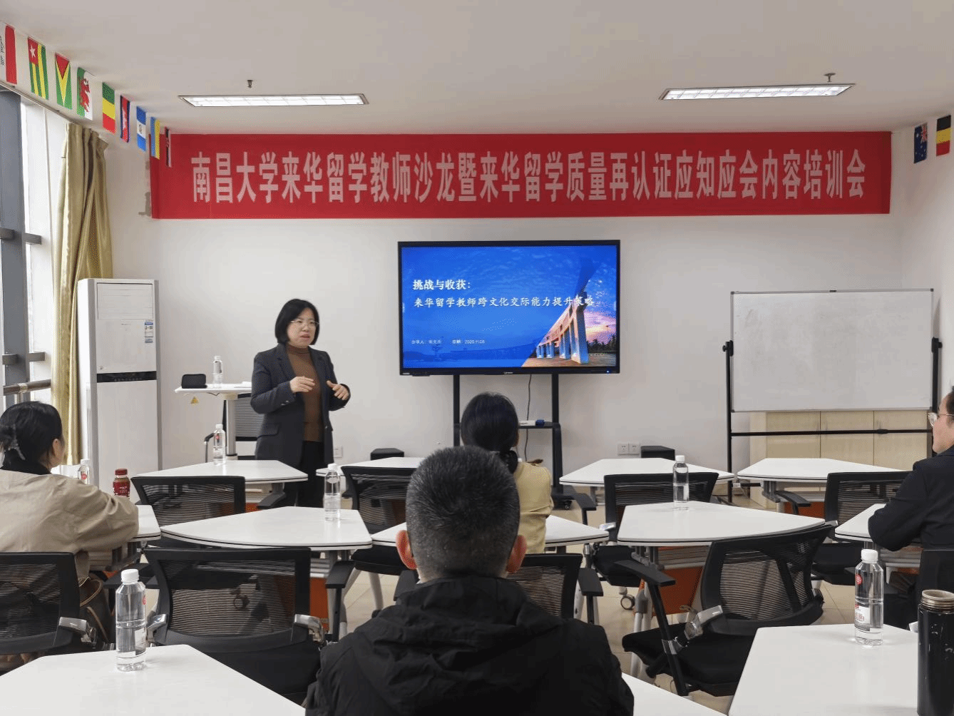 最后,国际教育学院培养办负责人刘青华老师就“来华留学质量再认证应知应会内容”进行了系统宣讲,详细解读了再认证的核心指标、认证要点及学校相关工作要求,帮助教师进一步明确质量保障的关键环节与责任分工。