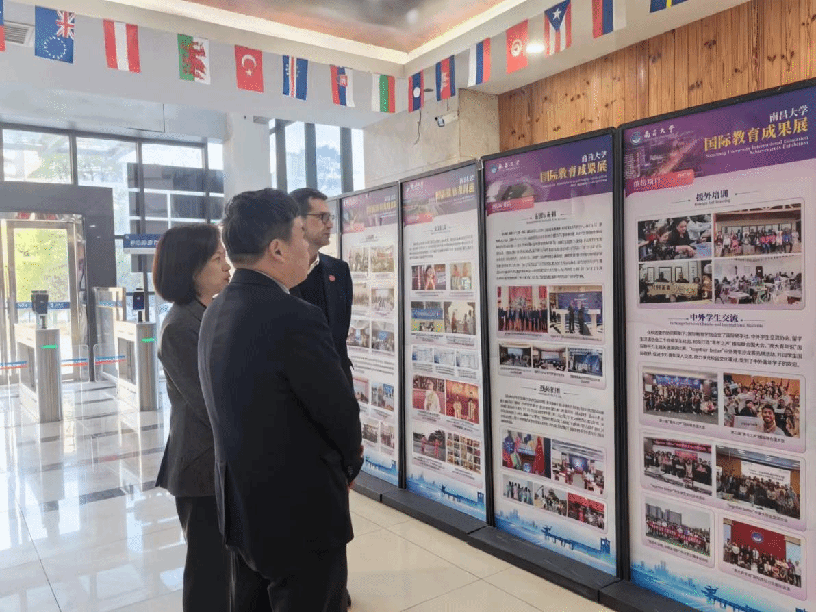 访问期间,黄晓红书记陪同外宾参观了学院办学成果展,详细介绍了学院的办学历程以及在国际化办学方面取得的成就。Stéphane Mottet副校长对学院在国际教育领域取得的成就表示赞赏。