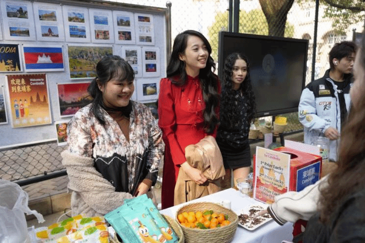 活动现场,南昌大学的来华留学生们化身 “跨国文化使者”,身着越南奥黛、乌兹别克斯坦刺绣长袍、非洲传统图腾服饰等特色服装惊艳亮相,瞬间点燃全场热情。来自东南亚、中亚、非洲等 10 余个国家和地区的留学生,精心打造了各具特色的文化展示摊位:异国美食香气扑鼻,吸引中学生们排队品鉴;手工编织挂毯、传统银饰、彩绘面具等工艺品琳琅满目,留学生们耐心讲解背后的文化寓意;趣味语言互动区更是人气爆棚,留学生教大家说简单的本国语言、认读特色词汇,中学生们则热情分享中文表达技巧,双语对话的欢声笑语回荡在校园里。