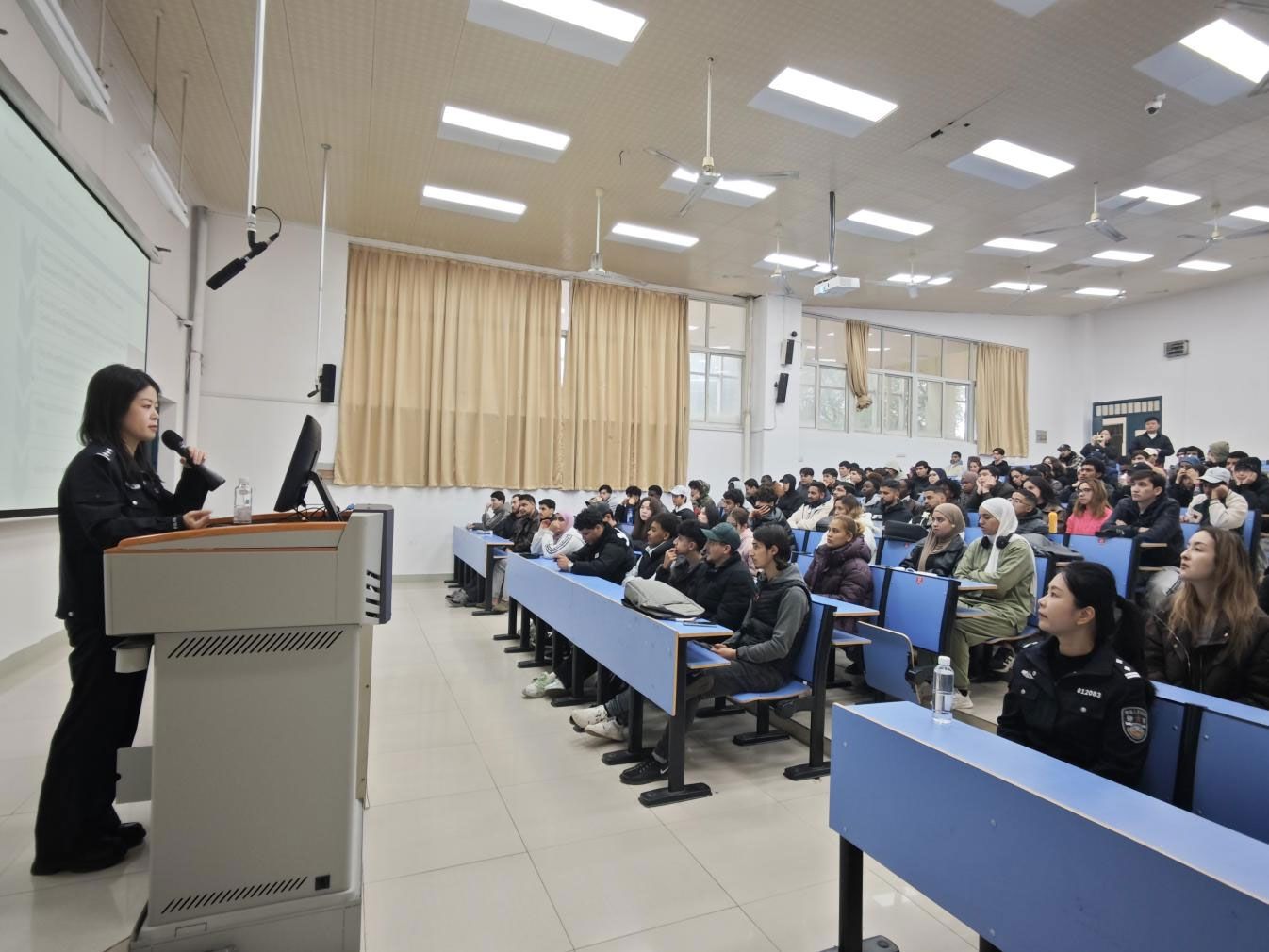 本次活动分为“送教”与“调研”,两个环节同步进行。在“送教”环节,出入境管理支队警官为2025级第二批来华留学新生带来了一场专题讲座。尹慧真警官系统讲解了来华留学签证类型、办理流程及所需材料,帮助学生明晰相关手续;谭茜警官结合法律法规与真实案例,重点阐述了在华居留、务工等管理规定,剖析了非法居留、非法务工的法律后果,并针对常见电信诈骗手段进行了安全防范提示。讲座后,留学生辅导员结合近期违纪案例开展了警示教育,进一步强化了新生对法律法规与校纪校规的理解。