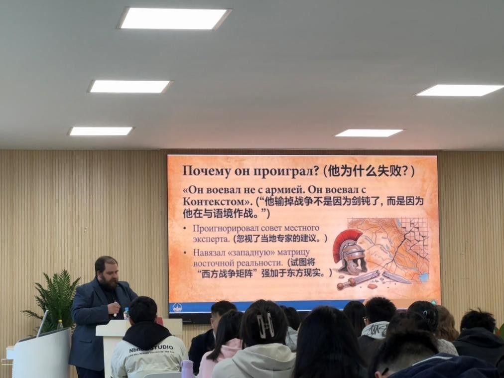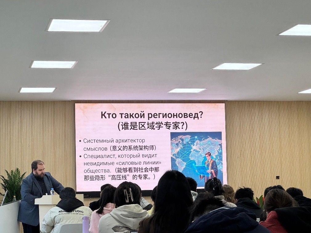 2025年12月29日,莫斯科国立大学历史学博士伊万·伊戈列维奇·帕夫洛夫斯基副教授应邀来校开展题为“区域研究:新时代的人文知识——机遇与挑战”的学术讲座。本次讲座由国际教育学院与外国语学院共同举办,两院部分教师、俄语专业学生、莫斯科国立大学国际本科留学项目学生及部分国际学生共同参与。