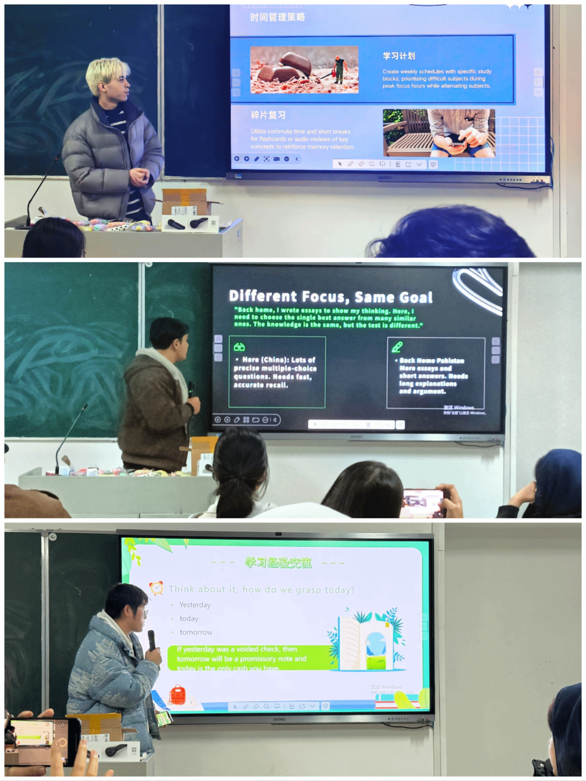 活动开场,主持人以轻松诙谐的方式引出期末备考这一共同话题,三位来自不同文化背景的中外学生代表依次分享各自的复习“秘籍”。从系统的时间管理、高效的笔记整理到别具创意的心得分享,他们结合亲身经历,呈现了多元而实用的备考策略。现场互动积极,在坦诚的交流中,同学们不仅学习了具体方法,更感受到了并肩作战的温暖与支持,为期末征程注入了满满动力。
