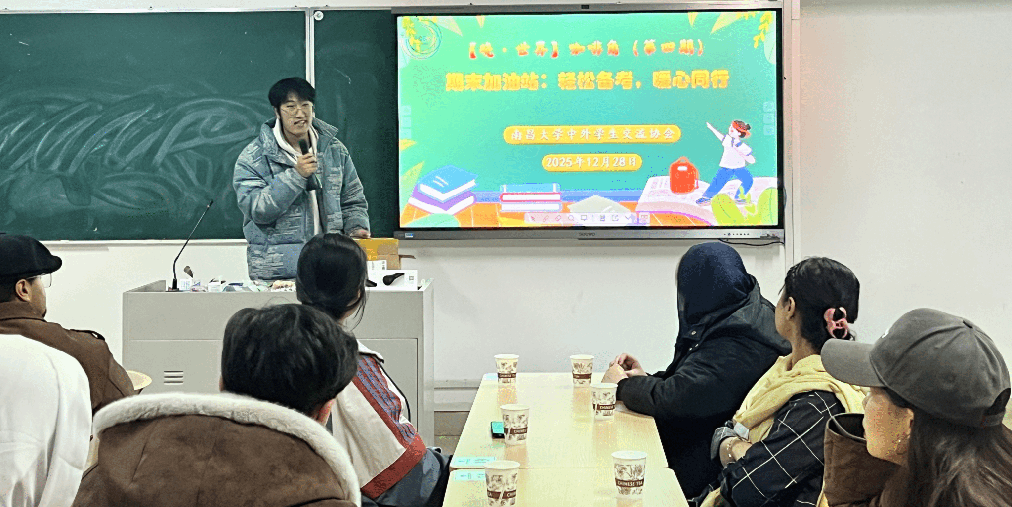 12月28日,南昌大学中外学生交流协会在外经楼107教室成功举办第四期[晓·世界]咖啡角活动。本期咖啡角活动聚焦期末备考与压力舒缓话题,吸引了来自中国、阿富汗、巴基斯坦、几内亚、科特迪瓦、摩洛哥、尼泊尔、土库曼斯坦、意大利等国的40余名中外学生参与。