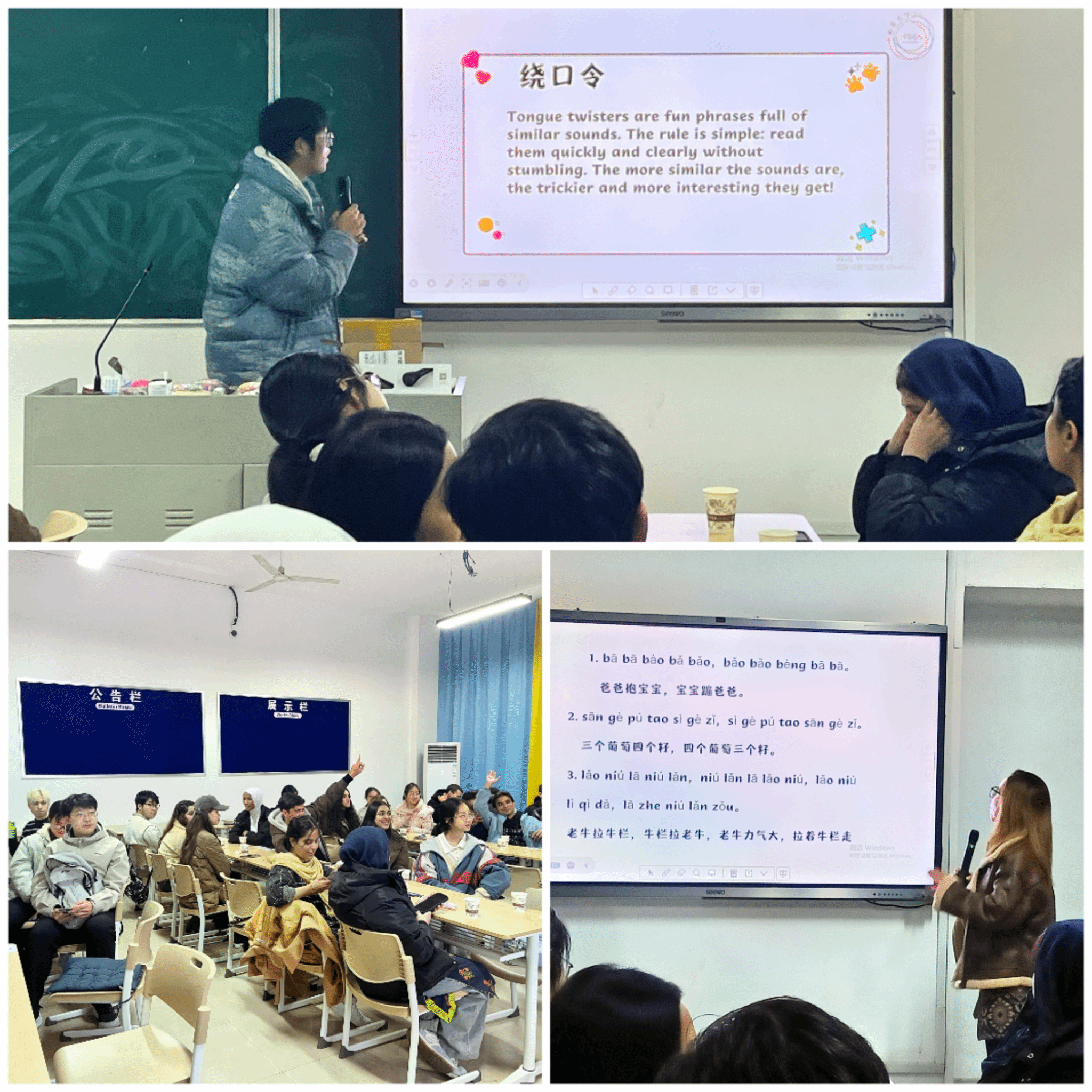 第一个游戏“绕口令”,迅速点燃了现场。中外学生踊跃尝试,在“四是四,十是十”的韵律与“石狮子,涩柿子”的节奏中碰撞,小小的失误引发了阵阵欢笑,快速拉近了彼此距离。