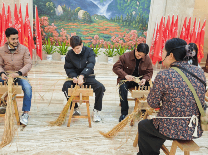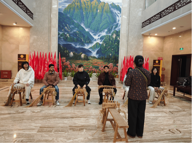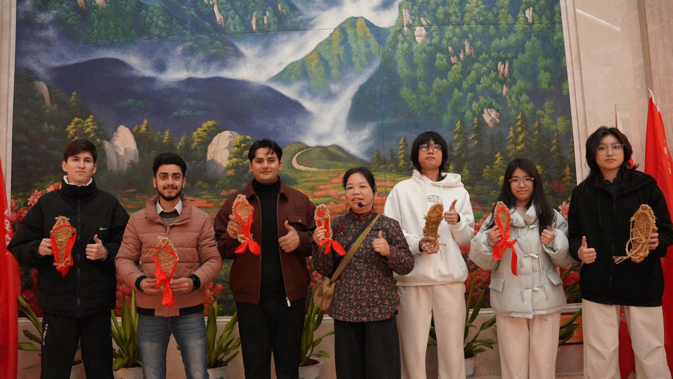 研学首日,师生们首先开启了“从一双草鞋开始井冈山之行”的体验课程。一根根稻草在指尖翻飞,中外学子们在老师的指导下亲手编制草鞋,在实践中聆听那段烽火岁月中“红军鞋”背后的艰苦奋斗故事。这一特殊的“见面礼”,让大家在动手劳作中不仅体验了非遗技艺,更直观地触摸到了井冈山精神的质朴底色。
