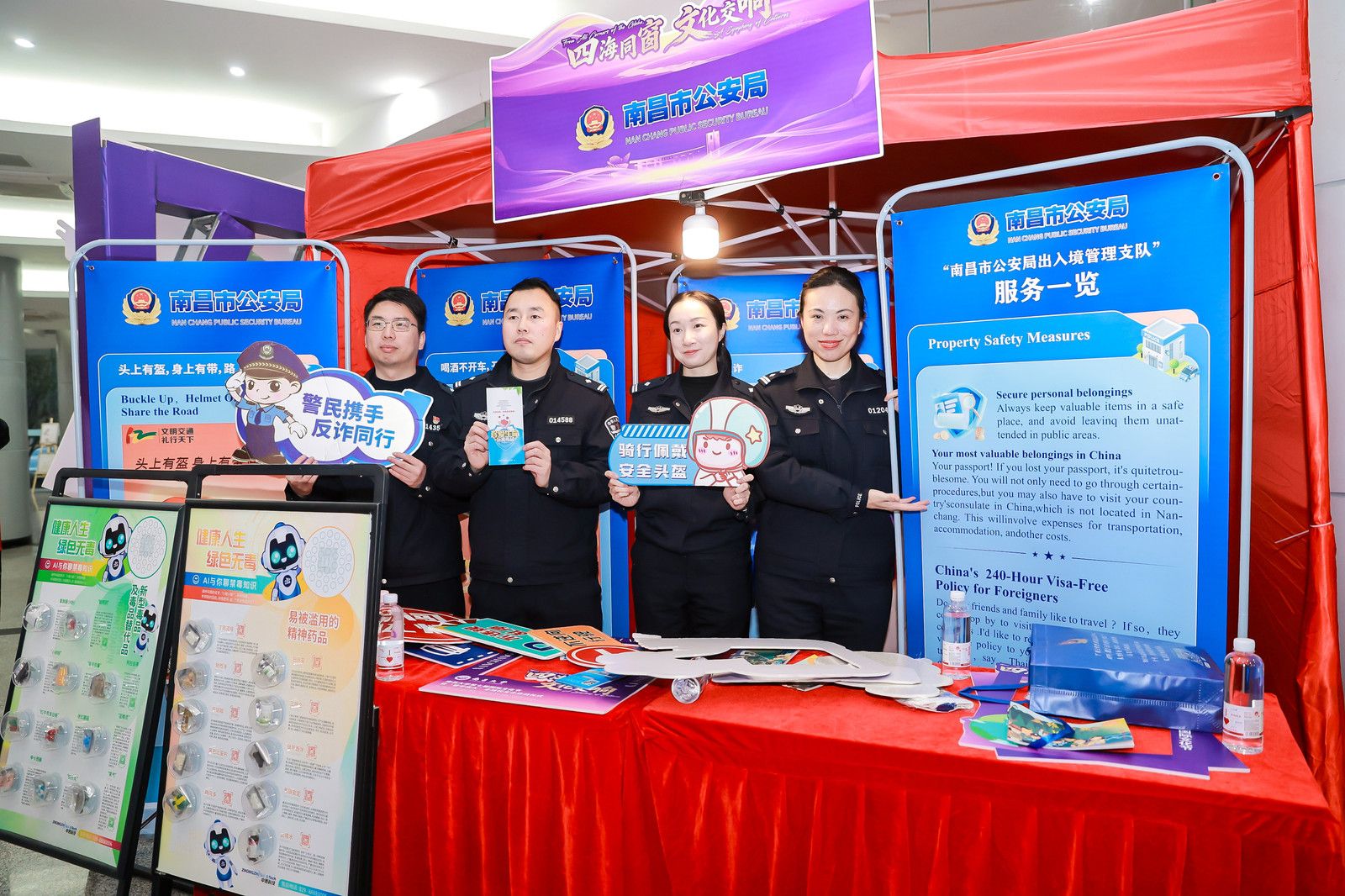 据悉,本次活动由南昌大学国际教育学院打造,外场同步举办世界文化风情展、学生优秀作品展及国际教育成果展,各国留学生化身文化使者,展示家乡美食与手工艺品。南昌市公安局展示了公安交通、禁毒、反诈、出入境四个警种,通过展板陈列、资料发放等形式,向现场师生普及安全知识,既展现了警务服务的专业风采,也搭建起警校联动的沟通桥梁,为活动筑牢安全保障防线,以实际行动践行共育共管责任,护航中外学子平安求学、健康成长。