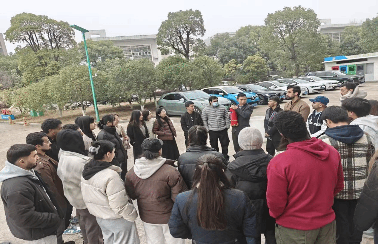 3月4日下午,这场别开生面的消防实操培训在国际教育学院楼前火热开展。这是一堂人人动手的“实战演练”,来自不同国家的留学生代表和中国师生并肩而立,认真聆听教员讲解灭火器的使用方法:指针指向绿色代表压力正常、保险销未脱落才能使用、站在上风口对准火焰根部喷射……“提、拔、握、压”四步操作法被大家默默记下。