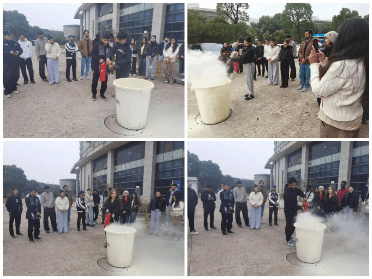 “提起灭火器、拔掉保险销、握紧喷管、压下压把。”在专业教员的指令声中,国际教育学院的师生们轮番上阵,对准模拟火源一阵“扫射”,白色粉末喷薄而出,火焰应声而灭。