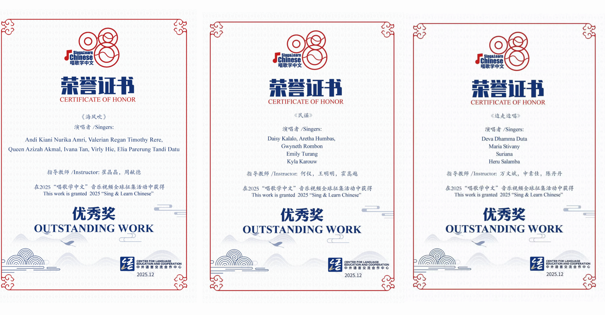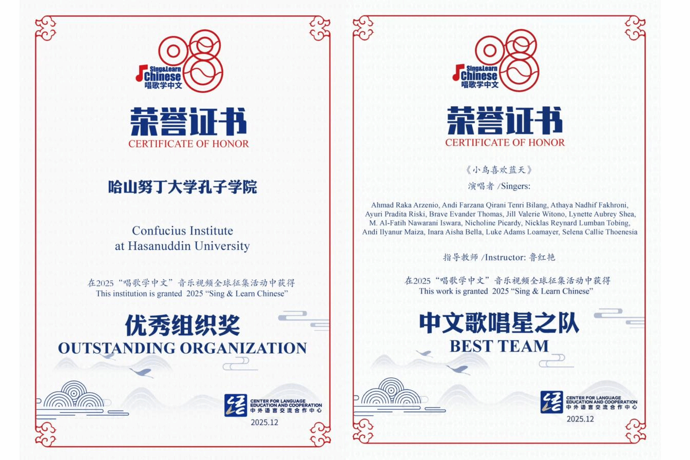近日,由教育部中外语言交流合作中心举办的2025年度“唱歌学中文——与自然和鸣”主题季音乐视频征集活动获奖名单正式公布。本次活动共吸引了来自57个国家的1471位青少年参与,收到470部音乐翻唱作品和中文秀视频,刷新年度参与人数与作品量新高。经过专家组评审,36个音乐作品荣获“最佳中文音乐视频奖”“最佳中文演唱奖”等六个单项奖,百余个作品获得优秀奖、鼓励奖。我校印尼哈山努丁大学孔子学院斩获 “中文歌唱星之队” 单项奖、优秀奖及优秀组织奖。
