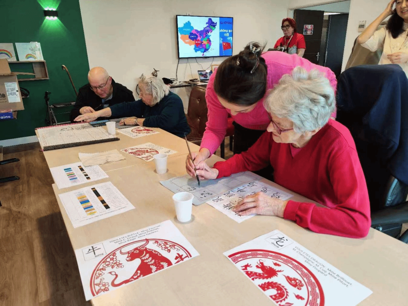 瓦莱丽·纳丹女士为每位老人精心准备了新年红包。黄赞梅院长在红包信封上为老人们书写名字的中文翻译,并在信封内放入写有其生肖的红纸,寓意新的一年吉祥如意、福寿安康。