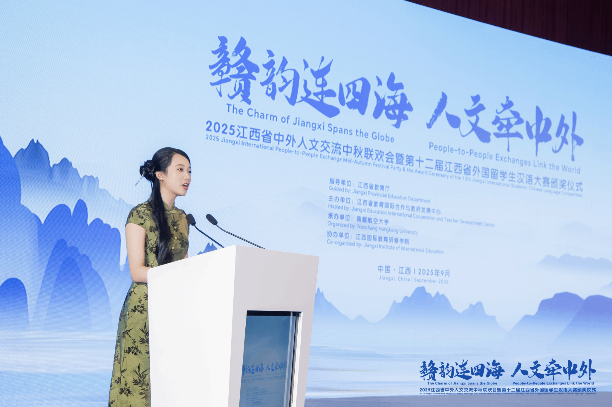 9月26日,“赣鄱连四海 人文牵中外”2025年江西省中外人文交流中秋联欢会暨第十二届江西省外国留学生汉语大赛决赛颁奖仪式在前湖迎宾馆顺利举行,副校长王立出席联欢活动,荣获本次大赛一等奖的我校越南籍留学生NGUYEN ANH DIEP(阮英蝶)代表在赣留学生发言。