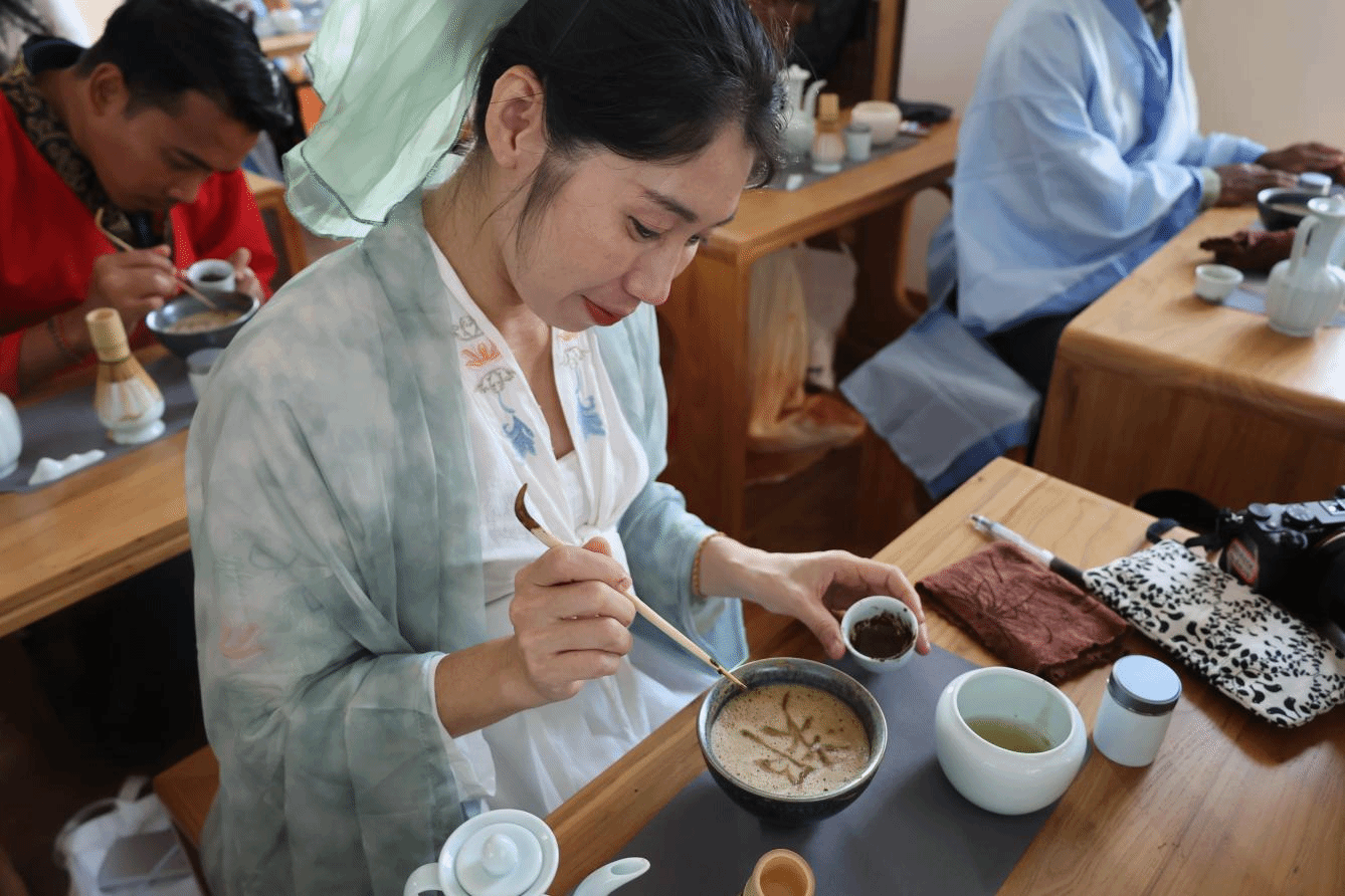 在实践教学环节,徐教授引领学员们亲身体验了极具宋代文人雅趣的点茶技艺。从茶具的选择到水温的掌控,从击拂的手法到茶沫的评判,每一个细节都彰显着中国古代茶事的精致与讲究。当清水在茶沫上勾勒出精美图案的“茶百戏”展现在眼前时,现场响起阵阵惊叹。塞拉利昂弗拉湾附小校长Lucy Mamie Egbenda在体验后表示:“这种将艺术融入日常生活的文化实践令人震撼。点茶不仅是一门技艺,更是一种生活美学的传承,这种深度的文化体验具有极高的教育价值,为我们今后的教育工作提供了全新的思路。”