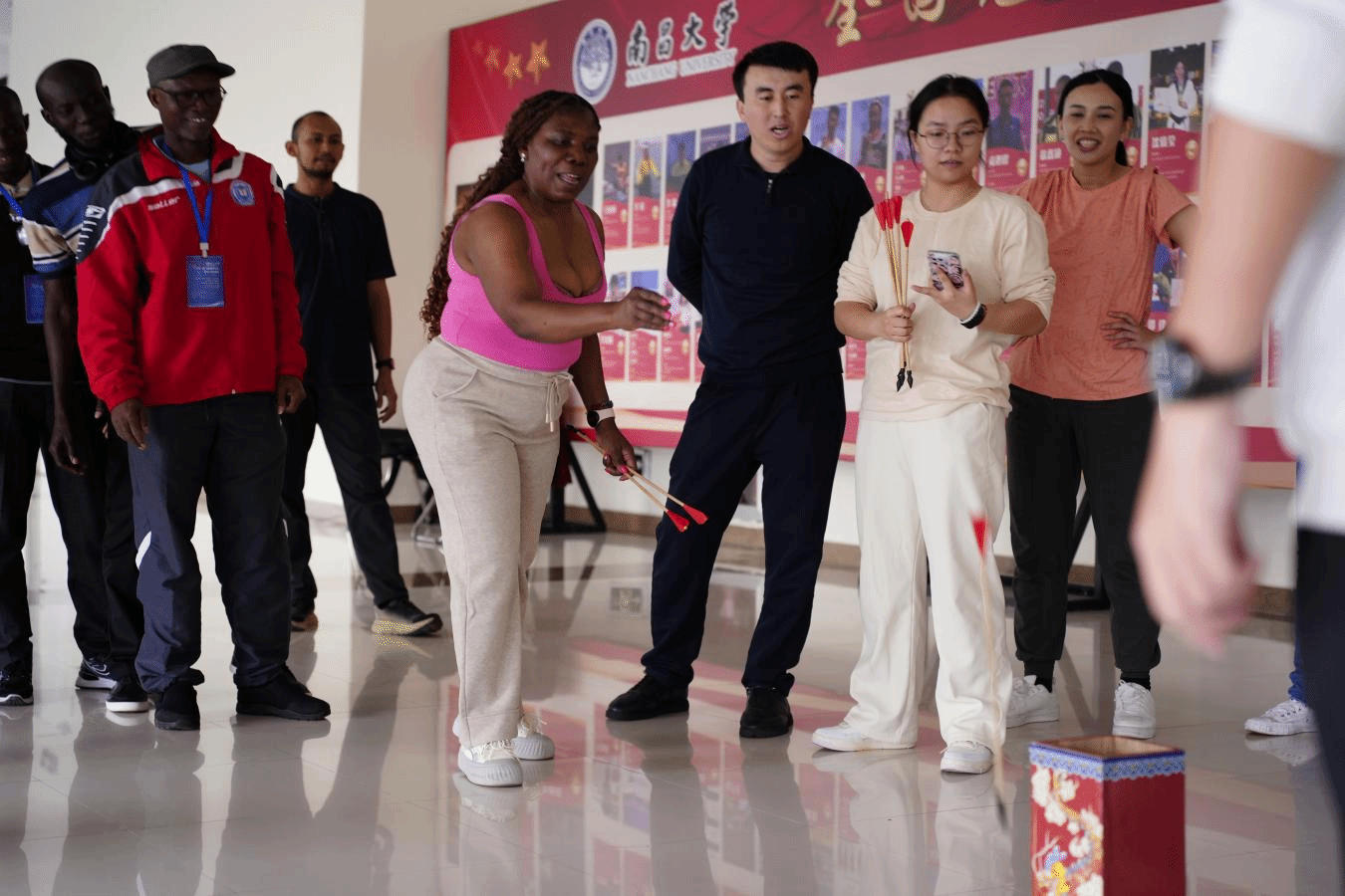 武术教学之外,本次体验活动还设置了投壶、滚铁环、抽木陀螺、踢毽子等中国传统民间游戏体验环节。其中,源自古代礼仪的投壶项目引起了学员们的浓厚兴趣。在南昌大学志愿者的讲解和示范下,学员们体验了这一古老的运动,感受其中“张弛有度、进退有礼”的文化内涵。