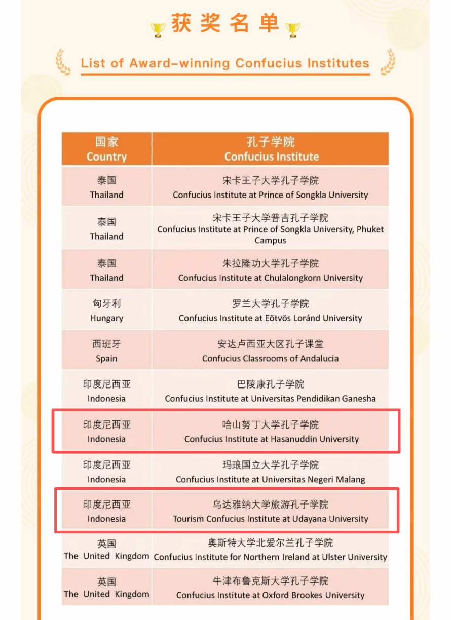 3月31日,中国国际中文教育基金会公布“2025年度优秀通讯孔院”评选结果,全球500余所孔子学院中共有42所入选,我校印尼哈山努丁大学孔子学院、乌达雅纳大学旅游孔子学院榜上有名。