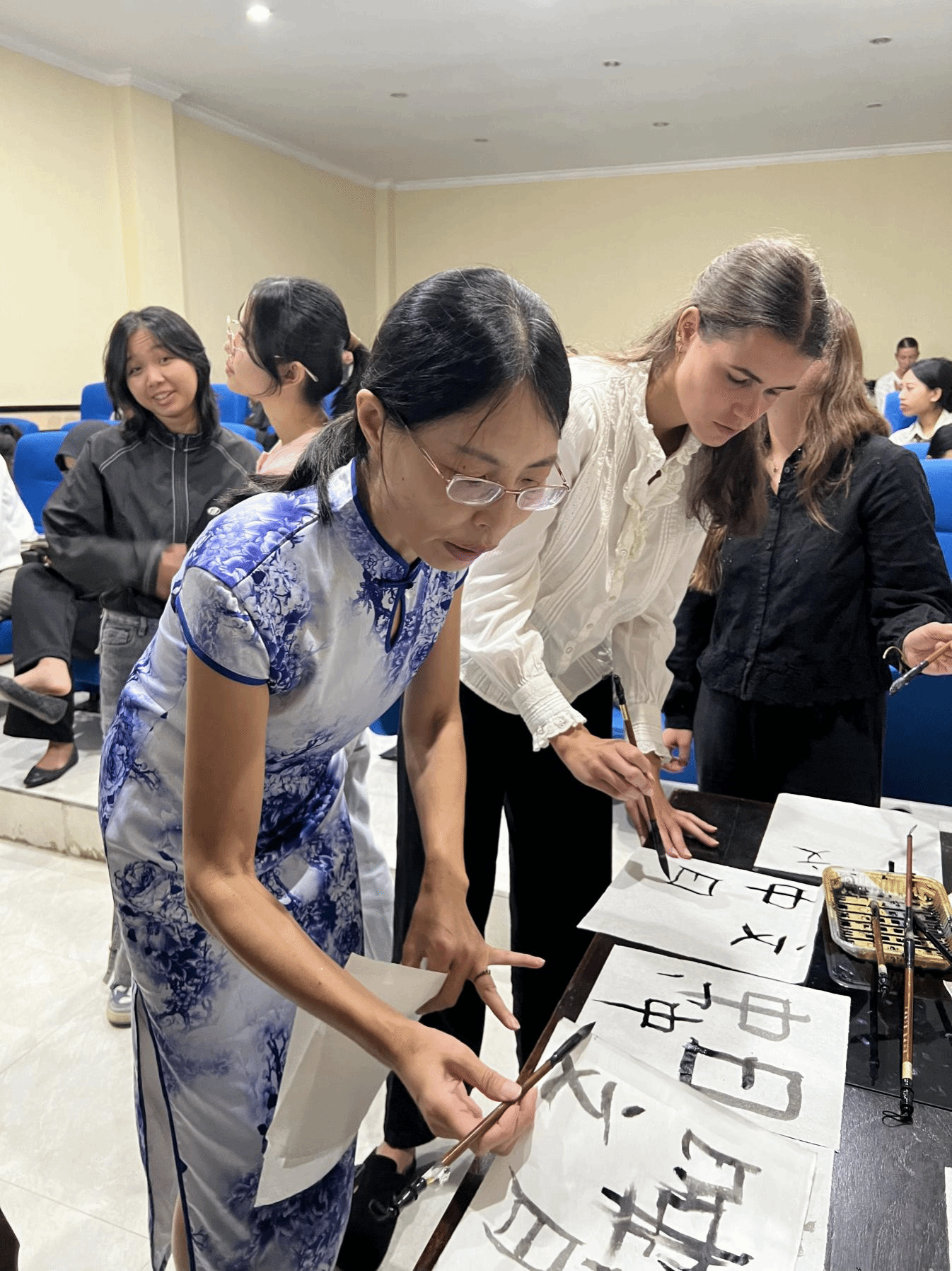 四个教学点各展所长、各具特色,从肢体演绎的古朴汉字到自然相融的创意表达,从汉服雅韵、笔墨书香到烟火缭绕的饺子盛宴、轻快灵动的中文传唱,活动覆盖不同专业、不同中文水平的学子,让每一位参与者都能在沉浸式体验中“遇见中文,点亮梦想”,在文化浸润中收获成长与感动。