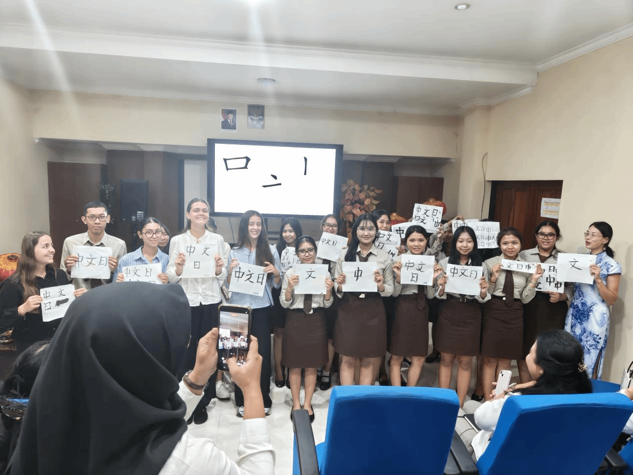 巴厘国立理工学院教学点则以汉字起源为主线,为近80名学子开启了一场穿越千年的文字之旅。现场,学子们聆听了仓颉造字的传说、猜甲骨文字义并用身体演绎汉字形态。随后,学子们执起毛笔,跟随老师研习中国书法,一笔一画临摹“中文日”三字,在墨香氤氲中感受中华书法的博大精深。活动在《歌声与微笑》的悠扬旋律中圆满落幕,每一个音符都承载着学子们对中文的热爱与向往。