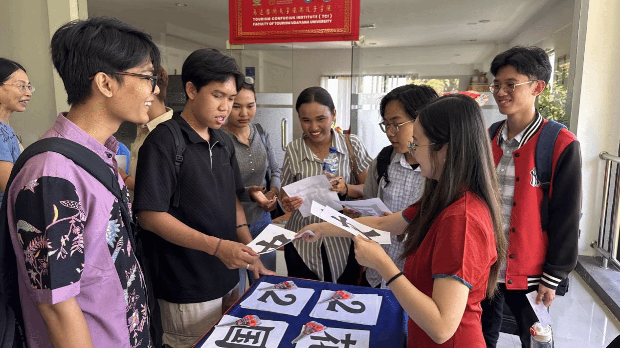 在乌达雅纳大学金巴兰校区教学点,60余名各专业学子齐聚一堂,参与了“甲骨文身体雕塑馆”“中文传声筒”“镂空汉字与自然拼图挑战”等系列活动。活动尾声,全体学子共学手势舞,在整齐划一的动作中凝聚这份对中文的热爱。
